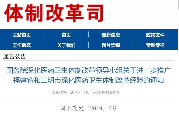 11月15日,國家衛(wèi)健委體制改革司發(fā)布《國務(wù)院深化醫(yī)藥衛(wèi)生體制改革領(lǐng)導(dǎo)小組關(guān)于進(jìn)一步推廣福建省和三明市深化醫(yī)藥衛(wèi)生體制改革經(jīng)驗(yàn)的通知》。文件提到2020年,按照國家統(tǒng)一部署,擴(kuò)大國家組織集中采購和使用藥品品種范圍。