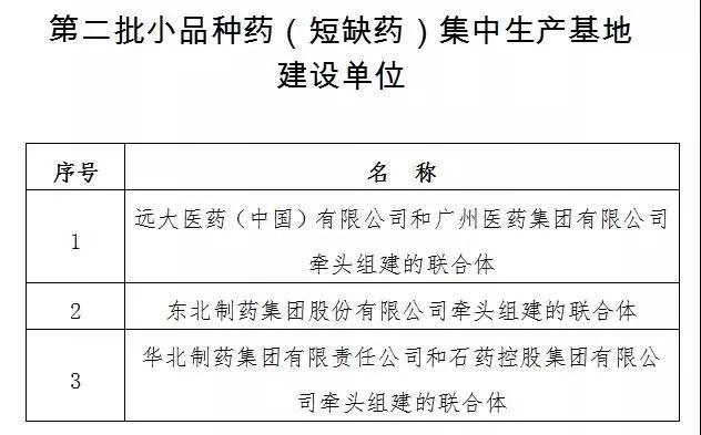 除了上述公示的3家聯(lián)合體,在今年1月28日,工信部已公布第一批小品種藥(短缺藥)集中生產(chǎn)基地建設(shè)單位名單。