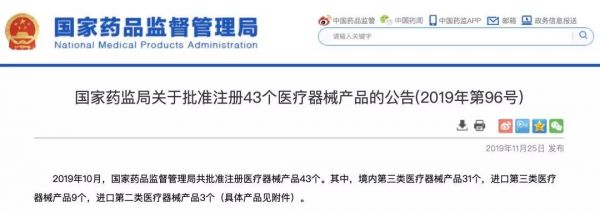 11月25日,國家藥監(jiān)局消息,發(fā)布了關(guān)于批準(zhǔn)注冊43個醫(yī)療器械產(chǎn)品的公告(2019年第96號)。