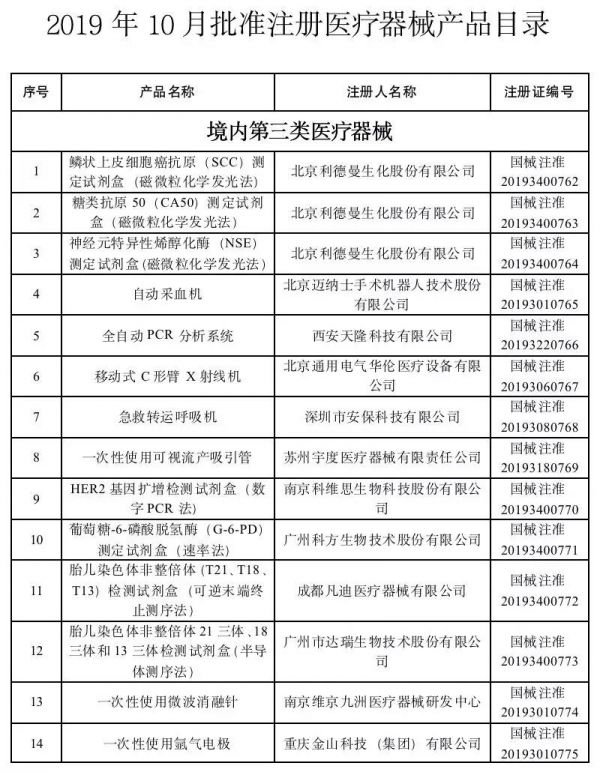 2019年10月,國家藥品監(jiān)督管理局共批準(zhǔn)注冊醫(yī)療器械產(chǎn)品43個。