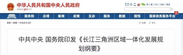 12月1日,國務院印發(fā)了《長江三角洲區(qū)域一體化發(fā)展規(guī)劃綱要》,并發(fā)出通知,要求各地區(qū)各部門結合實際認真貫徹落實。