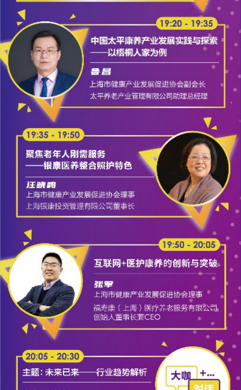 由從事老齡工作30年的殷志剛先生為您帶來中國式養(yǎng)老服務(wù)現(xiàn)狀及未來發(fā)展態(tài)勢—基于上海的實踐和后疫情時期的思考;引進(jìn)國際5H先進(jìn)理念,高端養(yǎng)老服務(wù)的領(lǐng)軍企業(yè)—太平養(yǎng)老產(chǎn)業(yè)管理有限公司魯昌助理總經(jīng)理,將以梧桐人家為例介紹中國太平康養(yǎng)產(chǎn)業(yè)發(fā)展實踐與探索;聚焦老年人剛需服務(wù),城市社區(qū)養(yǎng)老典范企業(yè)銀康醫(yī)養(yǎng),將由汪曉鳴董事長來分享以老年人為中心全生命周期的整合照護(hù)特色服務(wù);居家醫(yī)養(yǎng)服務(wù)的卓越代表福壽康的張軍董事長,將深化解讀互聯(lián)網(wǎng)+醫(yī)護(hù)康養(yǎng)的創(chuàng)新與突破等大眾民生關(guān)注的熱門話題。更有神秘嘉賓擔(dān)任主持,論壇同期輔以精彩的問答環(huán)節(jié),參與直播互動、答疑解惑的同時還有機會獲贈精美禮品!